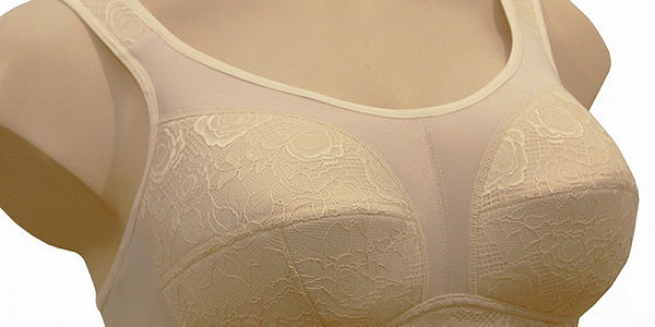 Бюстгальтер из эластичного кружевного полотна на подкладке из дублированного полотна,  передняя деталь пояса из кружевного эластичного полотна на подкладке из трикотажного полотна, с втачными карманами для протеза из х/б трикотажного полотна. Чашка мягкая. Пояс с застежкой сзади на 2-3 крючка. Бретель широкая, кружевная, с регулировкой длины сзади.